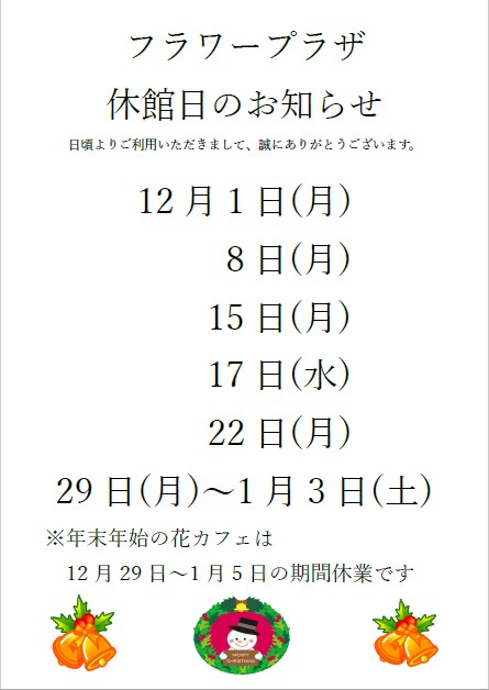 12月及び年末年始の休館日のお知らせ Tweet いつも名城公園をご利用いただきありがとうございます。 12月及び年末年始の名城公園フラワープラザの休館日は、下記の通りとなります。 (花カフェにつきましては、1/4(日)休業となります。お間違いのないようにご注意ください。)