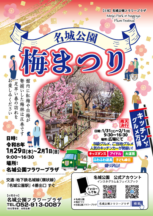 「名城公園梅まつり」のご案内 Tweet 毎年恒例の「名城公園梅まつり」を今年も開催いたします。 様々な種類の梅を用いて、フラワープラザ館内に梅林を再現します。 少し早い春の訪れをお楽しみください。 また、1/31(土)・2/1(日)の二日間、「キッチンカーグルメ万博」を同時開催いたします。 各日25台のキッチンカーや、キッズダンス、大道芸などのステージイベントが楽しめます。 (北園広場 9:30~16:30) ご来園お待ちしております。 ※日時などの詳細は下のチラシをご確認ください。