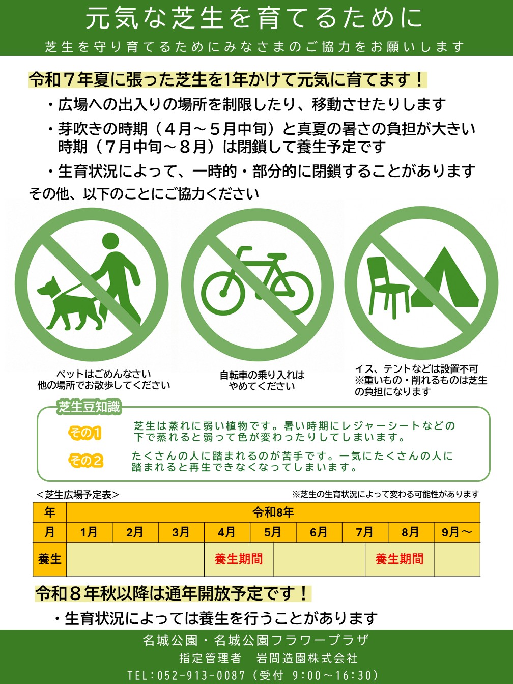 芝生広場のご利用について Tweet 日頃より名城公園をご利用いただき誠にありがとうございます。 令和8年1月より芝生広場の利用制限について、下記のとおり変更となりました。 引き続き、皆様にはご不便をおかけいたしますが、ご理解、ご協力のほどよろしくお願いいたします。